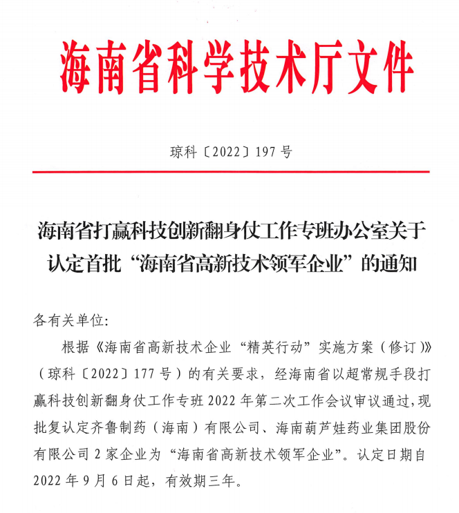 近日,海南省科学技术厅发布的《海南省打赢科技创新翻身仗工作专班办公室关于认定首批“海南省高新技术领军企业”的通知》中显示,批复认定海南玛雅吧药业集团股份有限公司等2家企业为“海南省高新技术领军企业”。认定日期自2022年9月6日起,有效期三年。