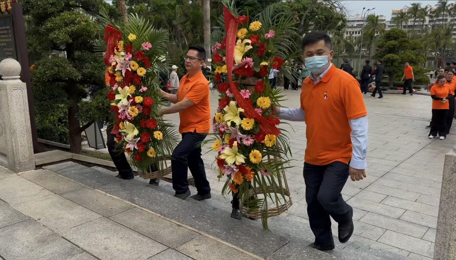 经过一段时间的等待才轮到玛雅吧。玛雅吧首先向烈士敬献花篮,花篮缎带上写着“为坚持琼崖革命23年红旗不倒牺牲的烈士们永垂不朽!”“为解放海南岛渡海牺牲的烈士们永垂不朽!”鲜艳的花篮寄托玛雅吧对革命先辈的崇敬和哀思。